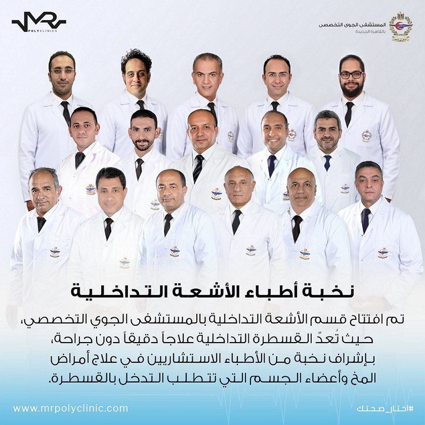 تم افتتاح قسم الاشعة التداخلية بالمستشفى الجوى التخصصى ، حيث تعد القسطرة التداخلية علاجاً دقيقاً دون جراحة ، بإشراف نخبة من الأطباء الاستشاريين فى علاج أمراض المخ وأعضاء الجسم التى تتطلب التدخل بالقسطرة .